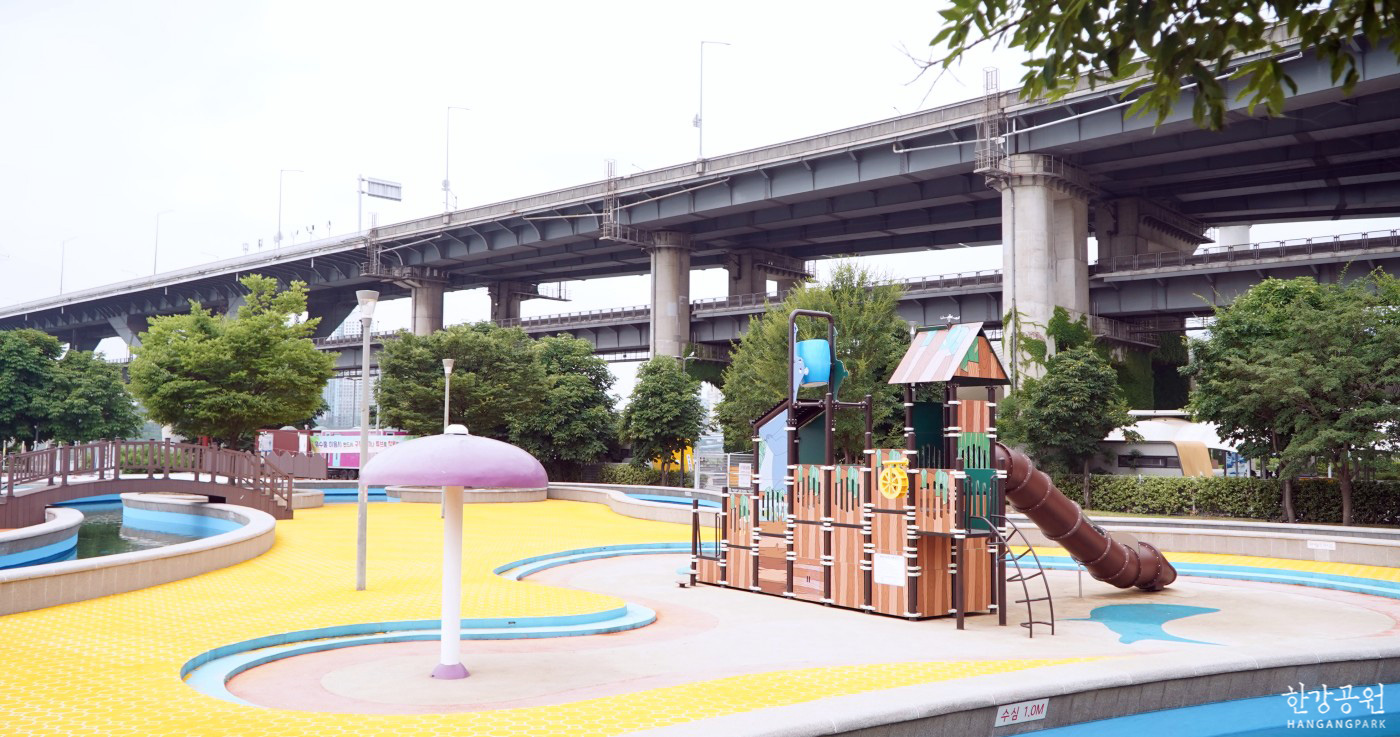 - 한강을 가장 가까이서 조망할 수 있는 인피니티풀 형태로 조성하였고, 5~8세 어린이를 동반한 가족 물놀이장, 한강을 배경으로 음악분수를 가동합니다.